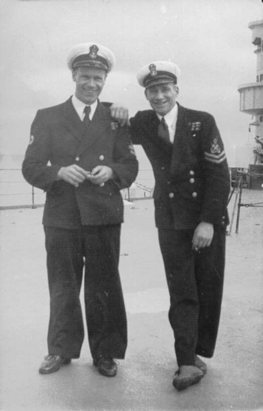 Acting Petty Officer (Gunnery) Bernard Hunt (right) on the flight deck of HMS. Vengeance. Other Petty Officer and date unknown.