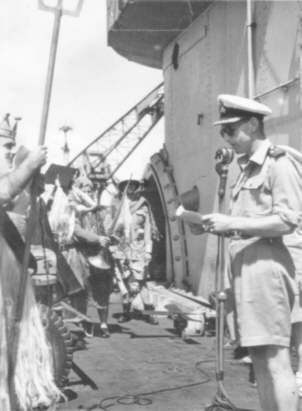Captain Neame on HMS. Vengeance, announcing the "Crossing of the Line" on the 9th July 1945.
