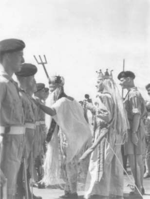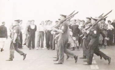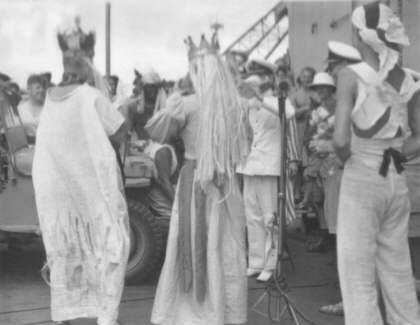 Crossing the Line Ceremony, King Neptune arriving by Jeep, on HMS. Vengeance, 9th July 1945.
