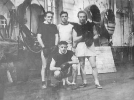 Back row: (left to right) Les Harris (Air Repair), the PTI and Harold 'Curly' Parkin (L/Telegraphist). Kneeling: Bert Hern (Torpedoman). Photo taken in the Hangar Deck (gymnasium) of HMS. Vengeance.