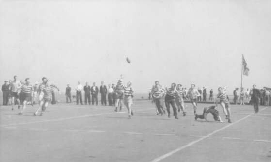 Rugby match on the flight deck of HMS. Vengeance.