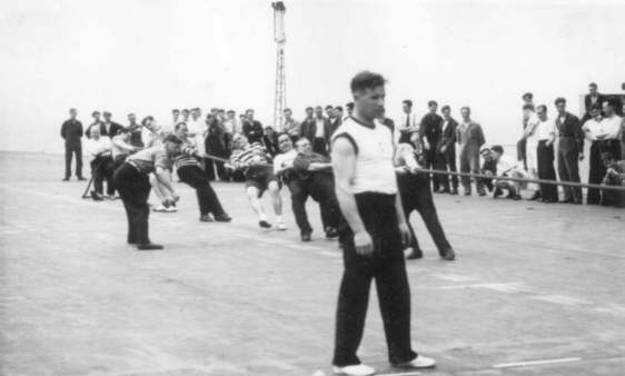 Tug of war, flight deck of HMS. Vengeance.