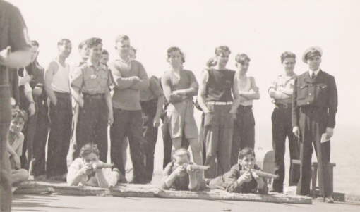Rifle shooting, flight deck of HMS. Vengeance.