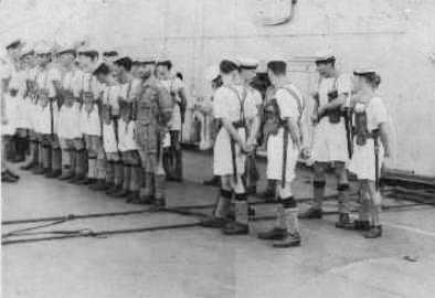 Boarding Party ready to disembark from HMS. Vengeance at Hong Kong in September 1945.