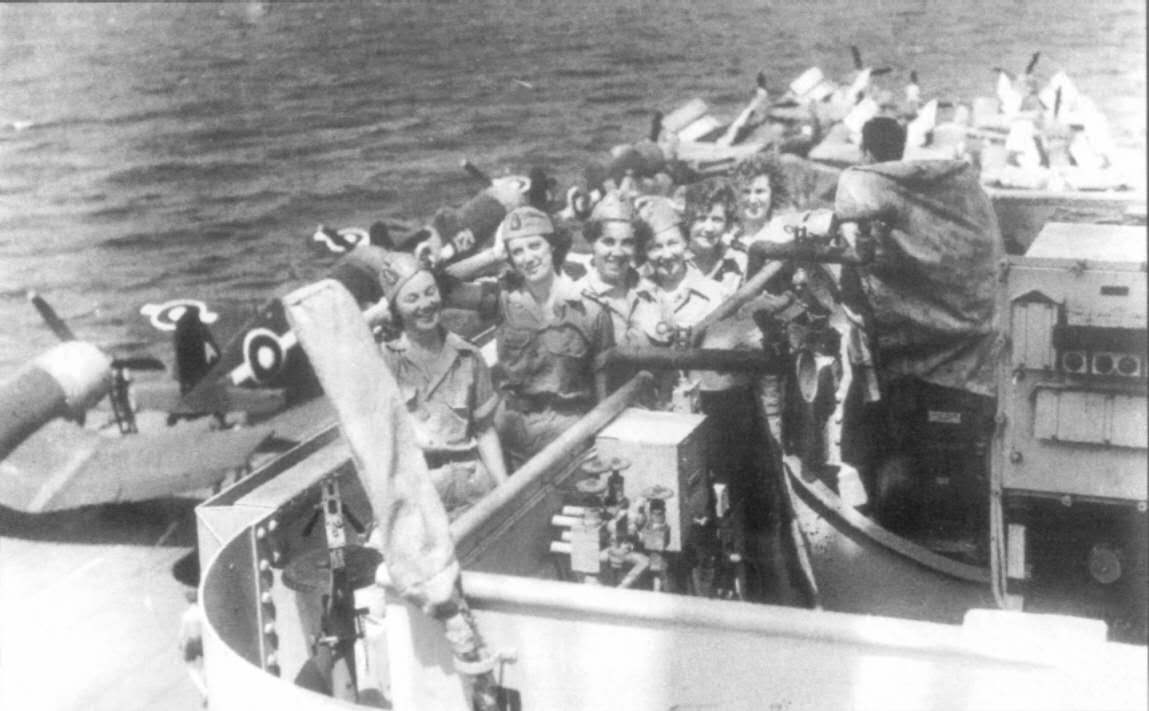 QARNNS aboard HMS. Vengeance en-route from Leyte to Hong Kong between 2nd & 5th September 1945. (Left to right) Sister Irvine (Tasmania), Sister Hippsley (Wells), Nurse Pardoe (Tenby, Worcs.), Nurse McIntyre (Dunbartonshire), Nurse Walker (Surrey) and Sister Surtees (York).