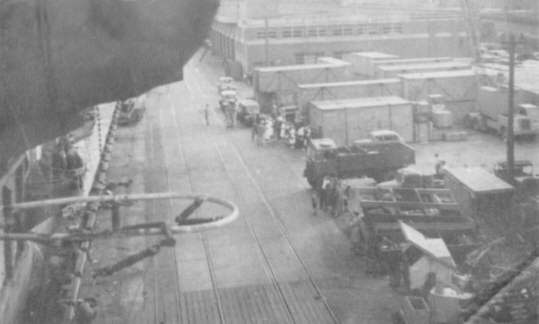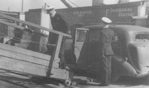 HMS. Vengeance being provisioned in 1945. Port unknown.