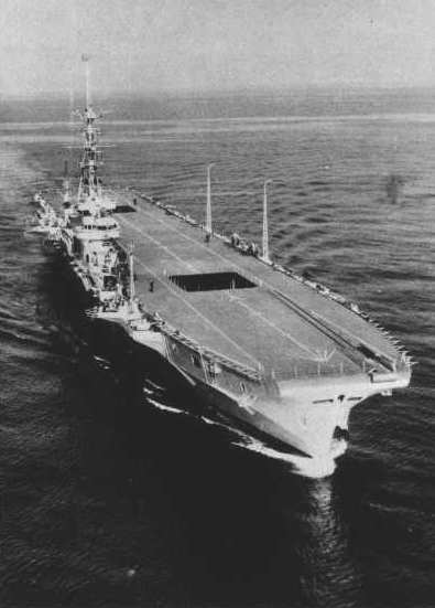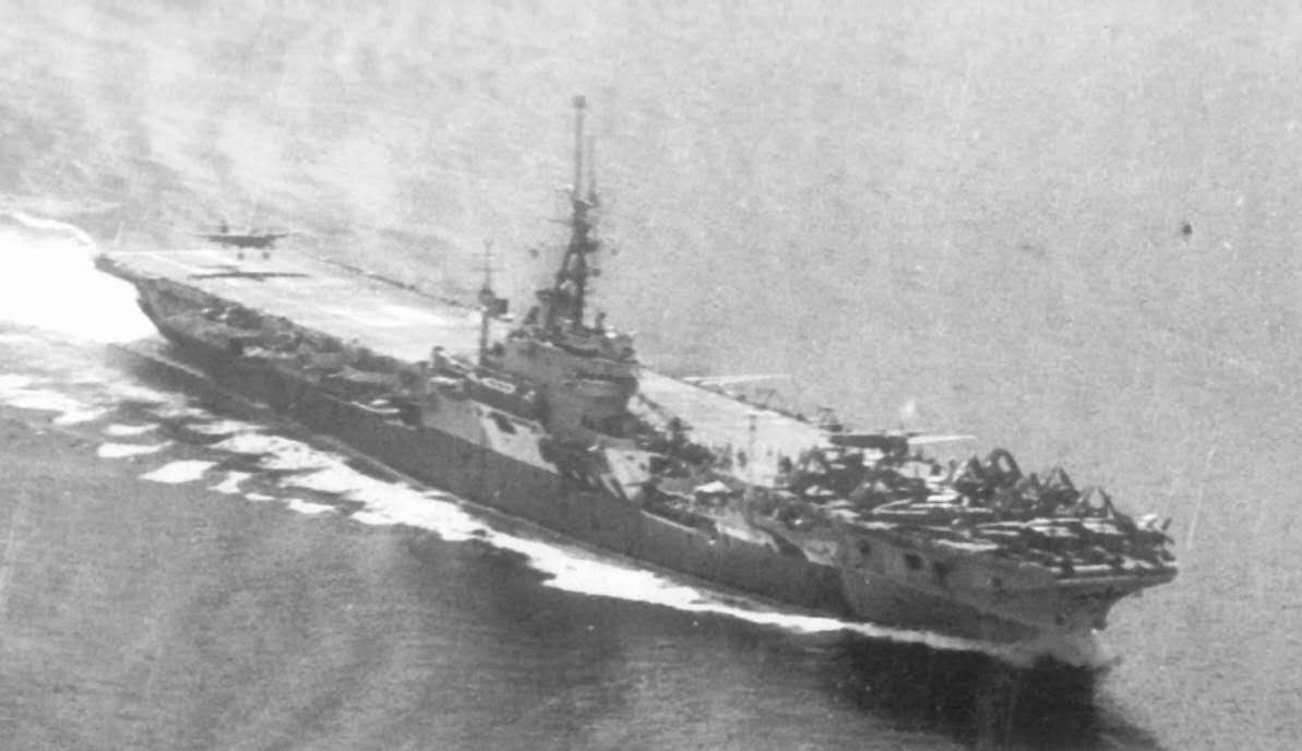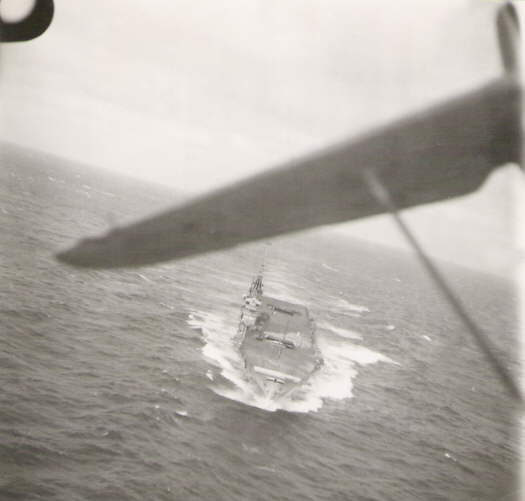 Aerial view of HMS. Vengeance at sea, taken from a Barracuda.