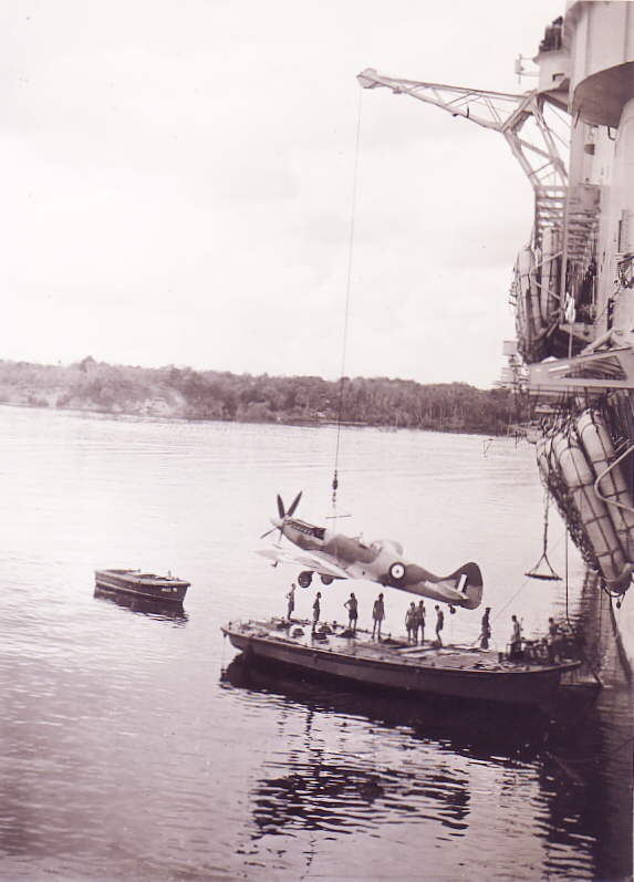 Spitfires being loaded onto HMS. Vengeance in Singapore, for transit to Japan between 14th and 15th April 1946. The Spitfires were Royal Indian Air Force aircraft. Photo shows HMS. Vengeance, starboard side, looking aft.