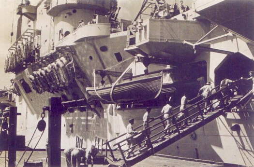 Royal Indian Air Force personnel boarding HMS. Vengeance en-route to Japan, April 1946.