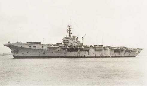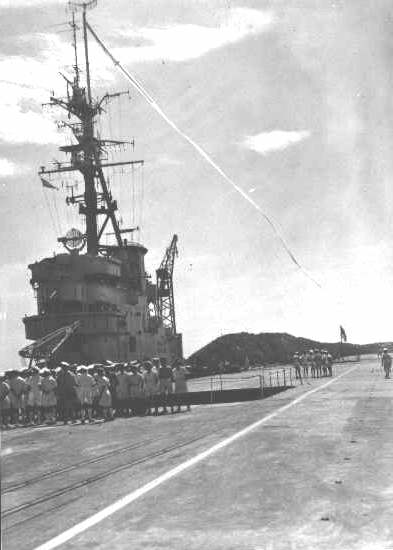 HMS. Vengeance leaving Colombo, Ceylon on 20th July 1946, flying the 'paying off pennant'.
