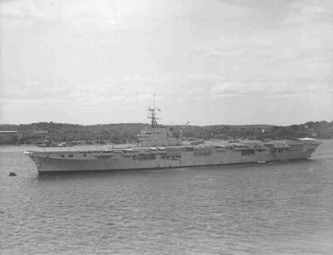 HMS. Vengeance in Trincomalee Harbour, Ceylon in July 1946. Flying the flag of Rear Admiral Bridges.