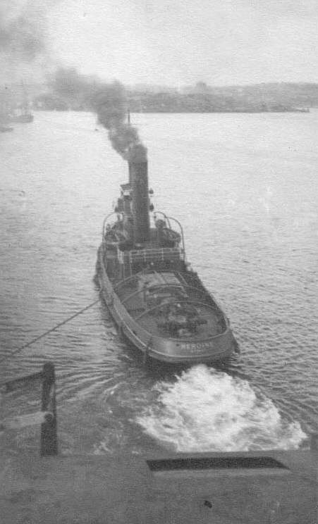 Tug boat 'Heroine' tows HMS. Vengeance out of port. Date and location unknown.