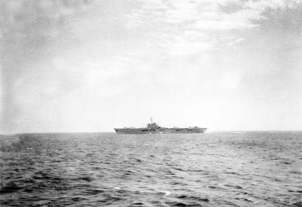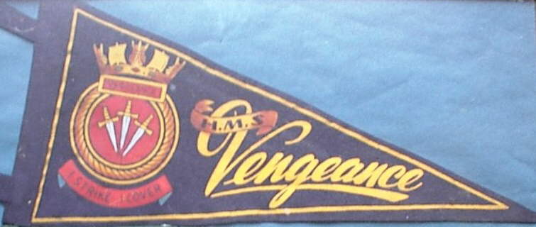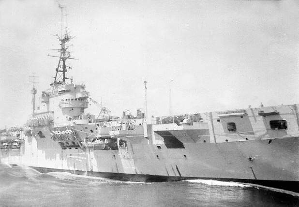 Port side of HMS. Vengeance, photographed from HMS. Tyrian in the Indian Ocean in 1946.