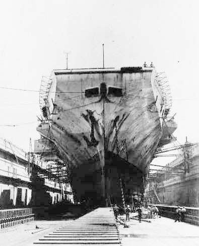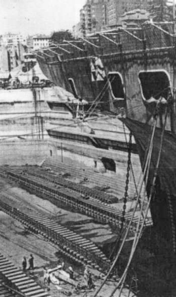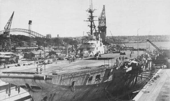 HMS. Vengeance in Captain Cook dry dock, Sydney, Australia in January 1946.