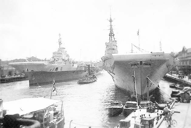 HMS. Vengeance (right) alongside in Woolloomooloo, Sydney, Australia. Date and other Carrier (left) unknown.