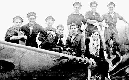 Armourer's aboard a Corsair at HMS. Vulture between 1944 - 45. (First Standing L to R) Armourer Reg Badger. (Seated 4th L to R) Butler?, (Seated 5th L to R) 'Nobby' Clark. The pilot (seated 6th L to R) is believed to be a Canadian. Others unknown.